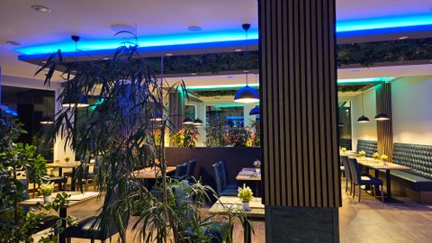Genießen Sie Ihre Mahlzeit in einer warmen, einladenden Atmosphäre, die zum Verweilen einlädt, ob Innen oder auf der Terrasse